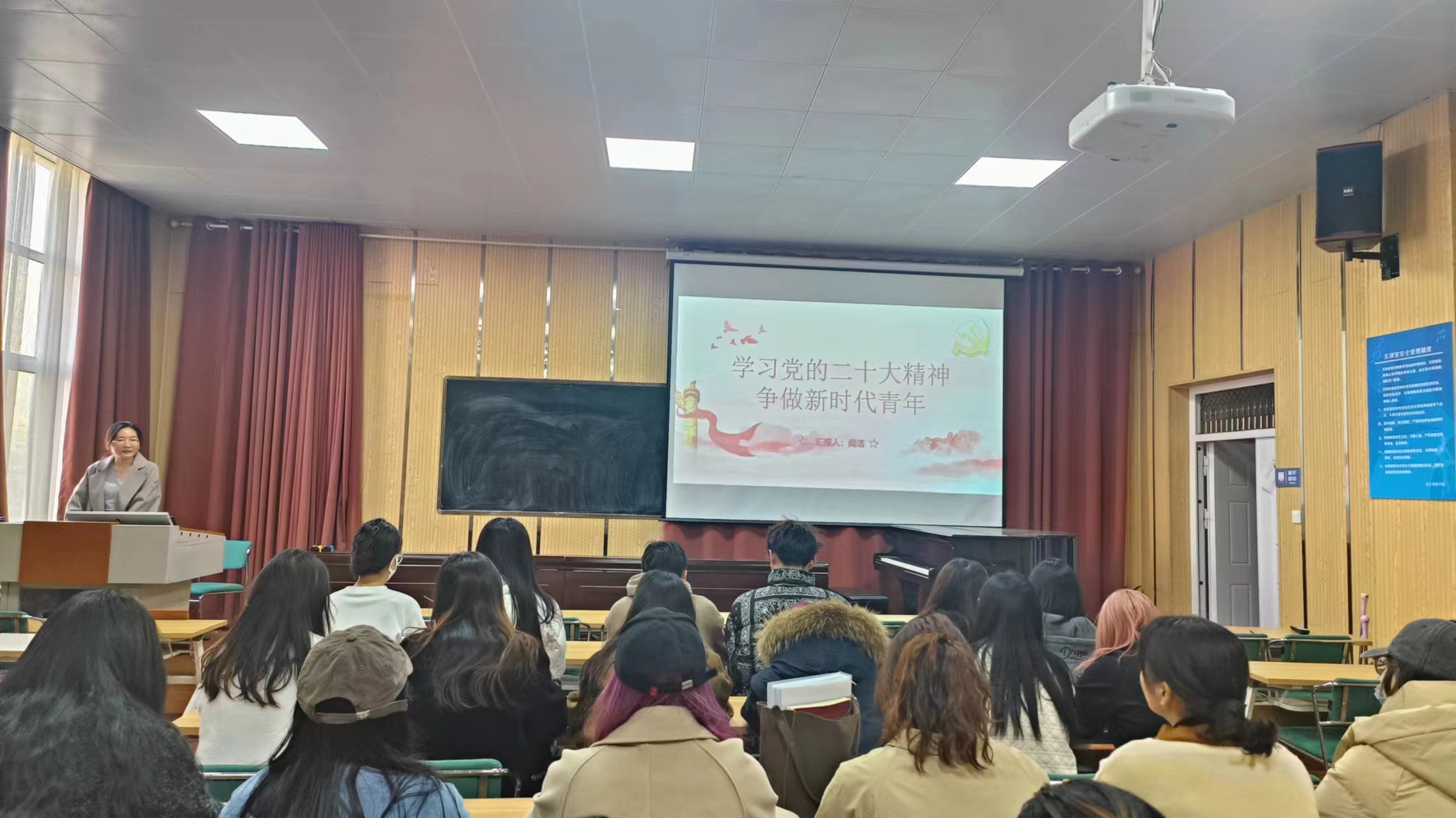 为了学习贯彻党的二十大精神,引导广大青年争做新时代好青年。12月8日上午,我院于艺术楼220开展主题为“学习党的二十大精神 争做新时代青年”分党课,党政办公室副主任阎洁主讲,全体积极分子参加。