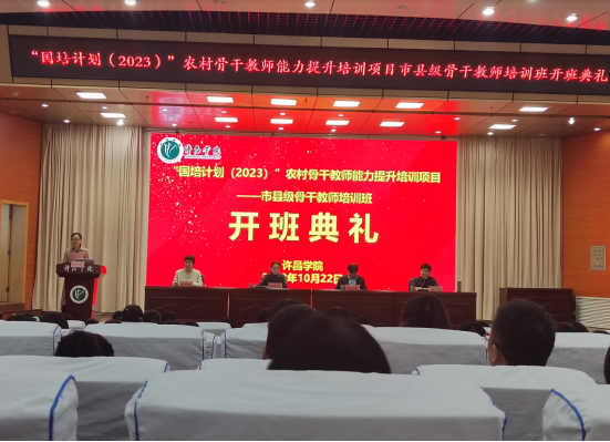 2023年10月22日许昌学院2023年“国培计划”骨干教师提升培训开班仪式于学术报告厅举行开班仪式,许昌学院继续教育学院直属党支部书记张雪洁、许昌学院继续教育学院副院长吴洁、各承办项目学院院长、各项目负责人及培训班学员共同参加了开班典礼。许昌学院继续教育学院直属党支部书记张雪洁致辞;许昌学院音乐舞蹈学院教师代表邓慧群老师发言;学员代表来自周口经济开发区东城学校的邓志勇老师发言。开班第一课给大家安排的是现场观摩我校的农耕博物馆和钧瓷馆。音乐舞蹈学院负责初中音乐骨干教师提升培训,聘请省内外知名专家和优秀一线教师授课,在学员学习环境、生活环境、安全保障等方面力求谋划周全,服务到位。本期开设的课程有《戏衣、色彩——戏曲舞台上的别样风采》《戏曲中的肢体语言与合唱指挥肢体语言的关系探究——以中小学合唱为例(一)》《戏曲中的肢体语言与合唱指挥肢体语言的关系探究——以中小学合唱为例(二)》《九月重阳菊花黄——越调《诸葛亮吊孝》选段排演(一)》《九月重阳菊花黄——越调《诸葛亮吊孝》选段排演(二)》。