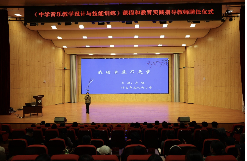 聘任仪式上杨天宏代表学院向许昌市教育科学研究中心中学音乐教研员杨华老师,许昌市文化街学校教育集团李旭校长,许昌实验中学孙颖老师,魏都区音乐教研员刘永辉老师,建安区教研室音乐教研员郑艳敏老师,东城区中学音乐教研员王萌老师,长葛十九中高级教师王国辉老师颁发了聘书。聘任仪式后,由李旭校长为在场师生作了名为《我的未来不是梦》的专题讲座。她结合中学一线教学岗位工作能力需求和自己工作经历,鼓励学生刻苦钻研,锻炼解决实际工作难题的思维和行动能力。李旭校长别开生面的讲座使在场师生对《中学音乐教学设计与技能训练》有了更为深刻的理解,也对师范教育课程体系建设的目标与任务有了全新的认识。
