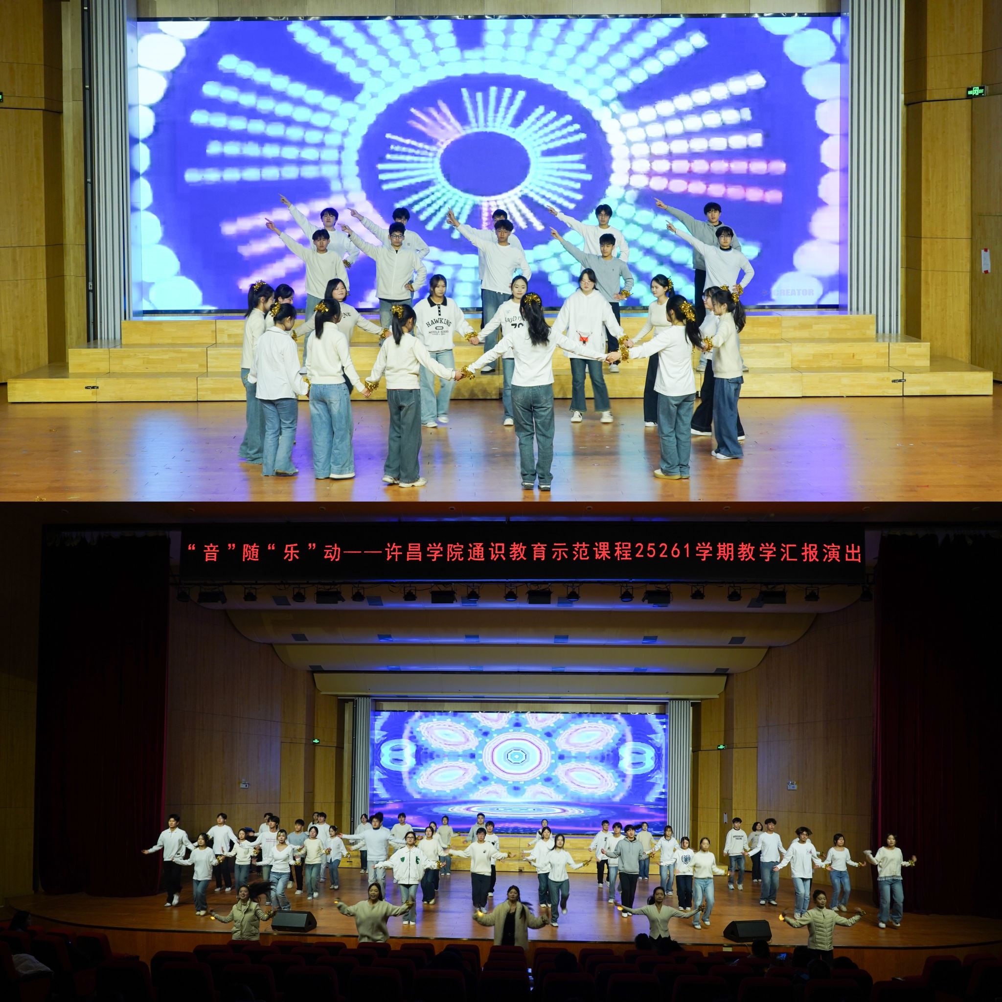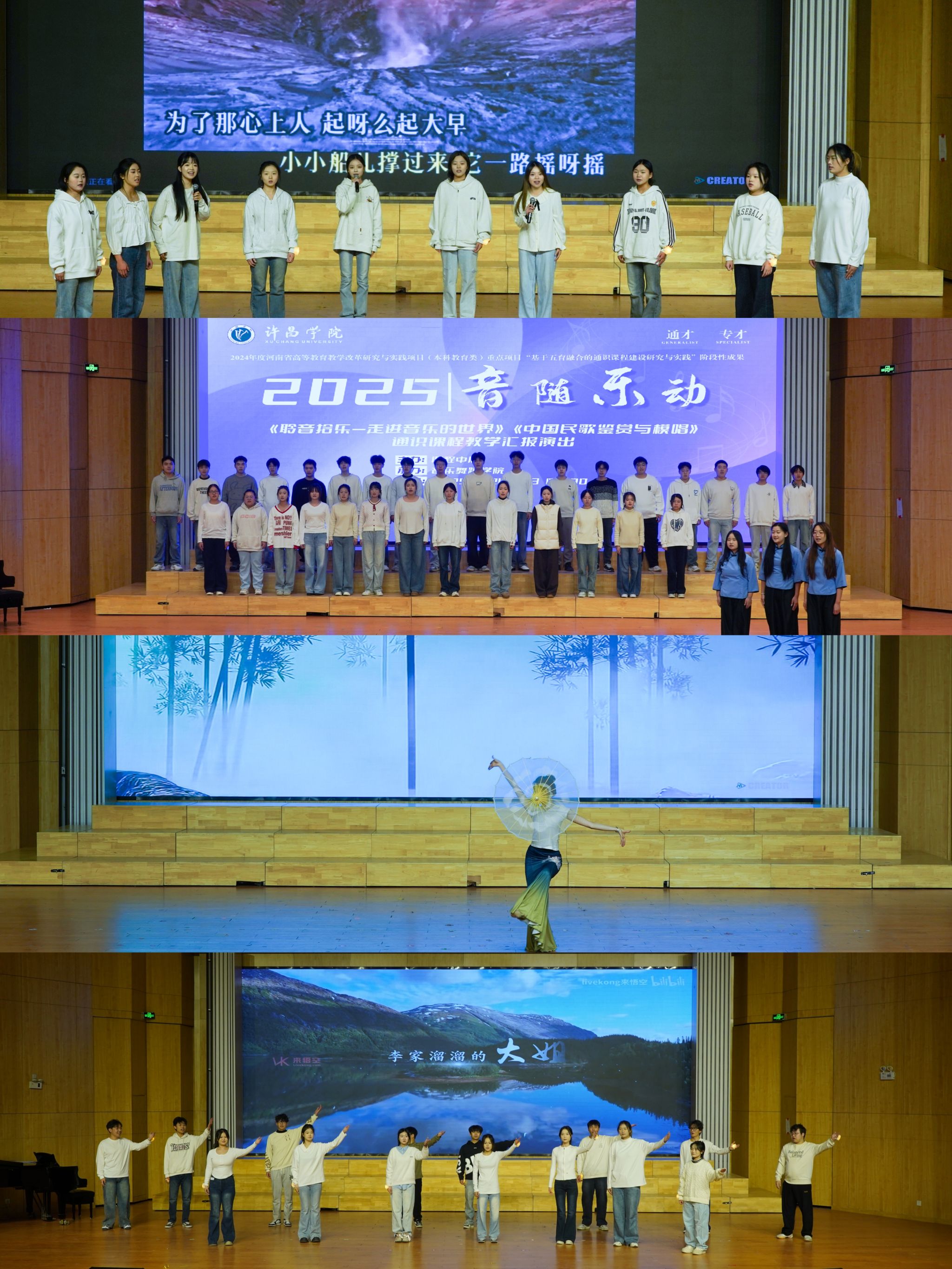 12月23日晚,“音”随“乐”动——许昌学院通识教育示范课程25261学期教学汇报演出在音乐厅圆满落下帷幕。本次活动由课程中心主办、音乐舞蹈学院承办,相关职能部门及学院领导、老师出席,近两百名学生参与汇报演出。