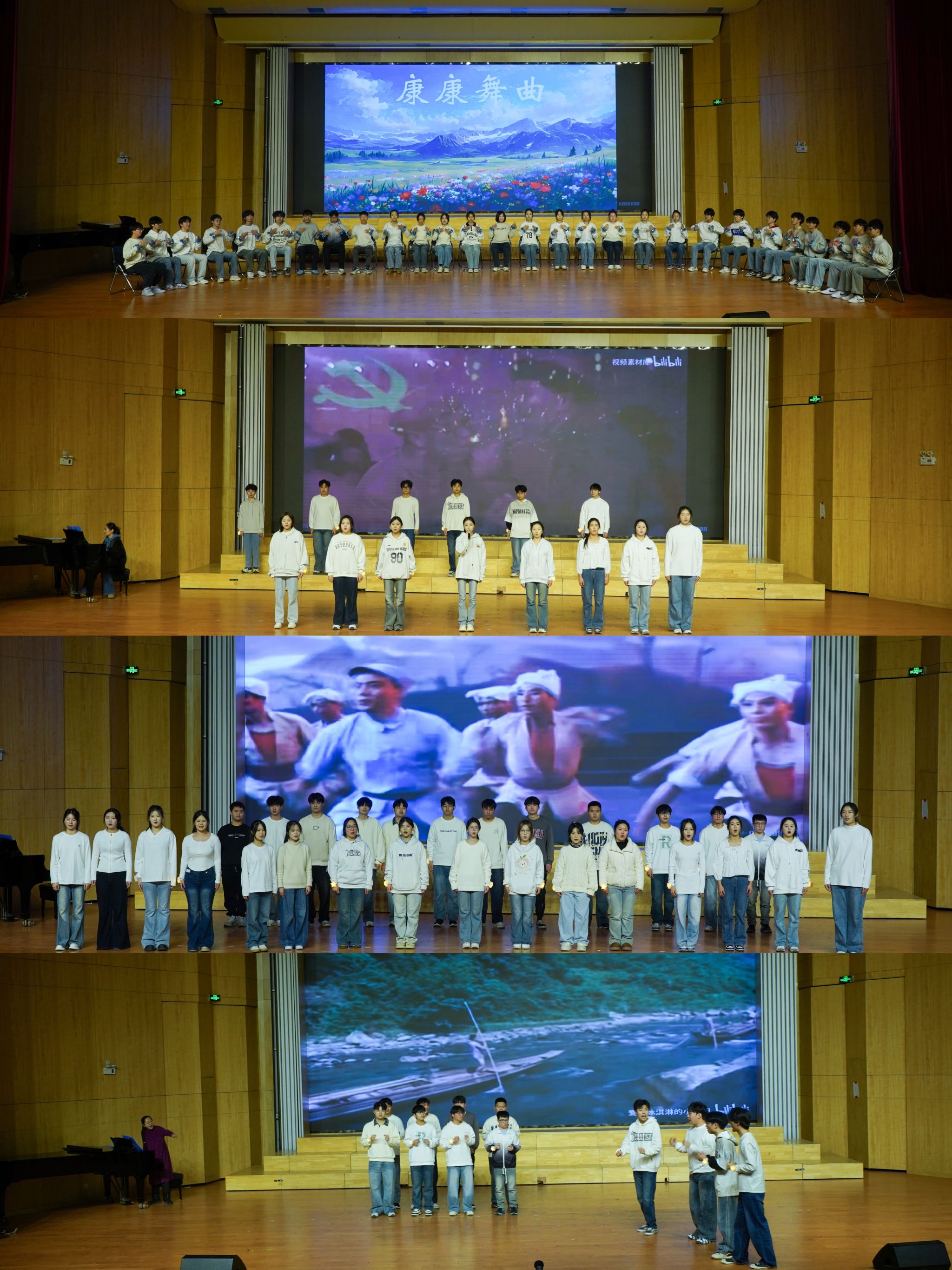 演出在情景小合唱《送别》中启幕,《水星记》的细腻演唱、《傣雨悠悠》的灵动舞姿、《怜悯》的深情演绎接连登场;民歌联唱《编花篮》《康定情歌》唤起文化记忆,身体打击乐《康康舞曲》尽显节奏活力,《妈妈的话》以歌声致敬亲情;“民歌新唱”环节对《知道不知道》《十送红军》进行当代诠释,《小镇姑娘》勾勒成长素描;劳动号子《川江号子》《军民大生产》重现集体力量,诗朗诵《我们的青春》书写青年风貌。最终,群舞《哈尼宝贝》将现场气氛推向高潮,为演出画上圆满句点。