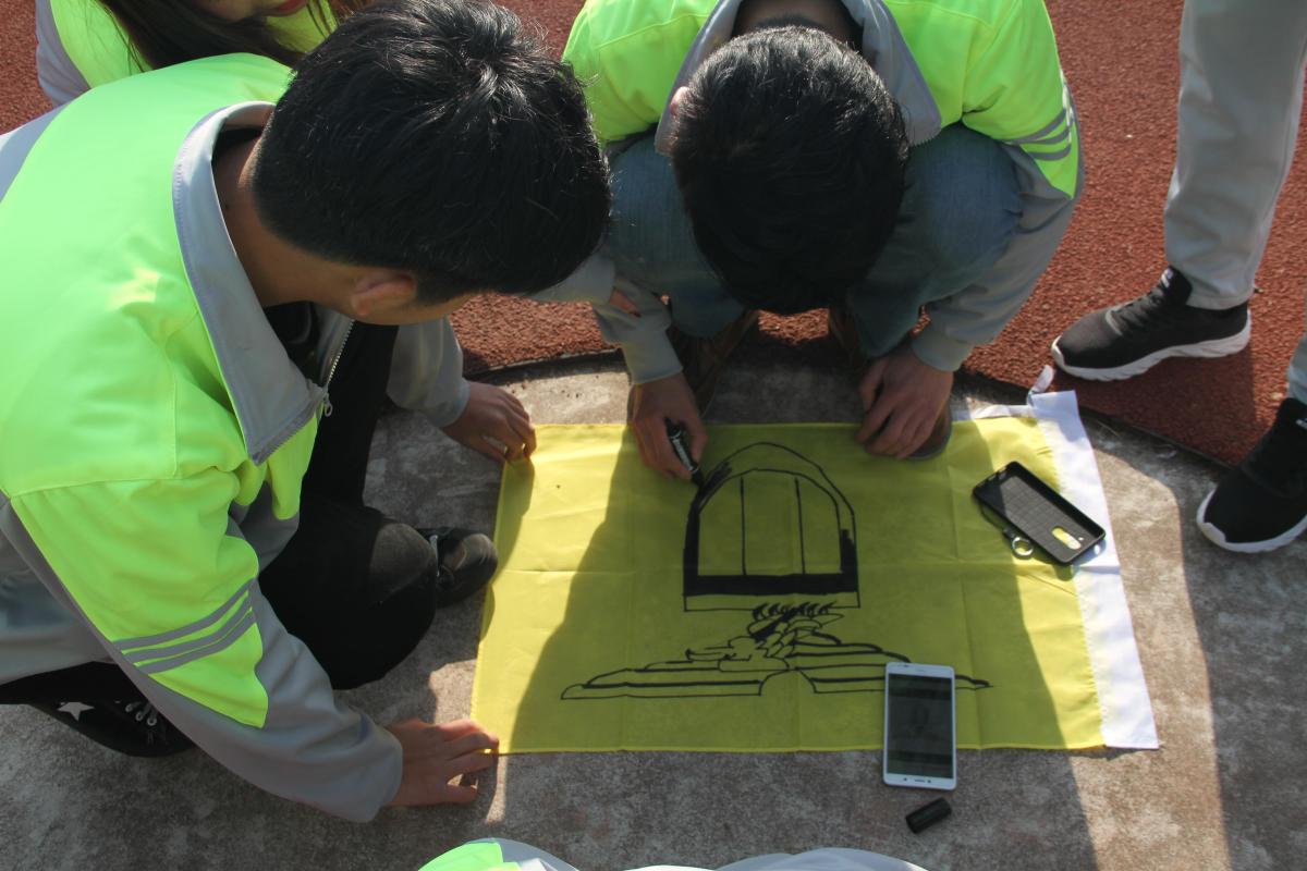 首先,在同学们教官和政委的带领下,找到了各自进行活动的场地。大家开始了“滚雪球”游戏的自我介绍。之后,各队在队旗上画上属于自己队的标志,起队名、口号、队歌。之后各队开始相互结合在一起玩游戏。
