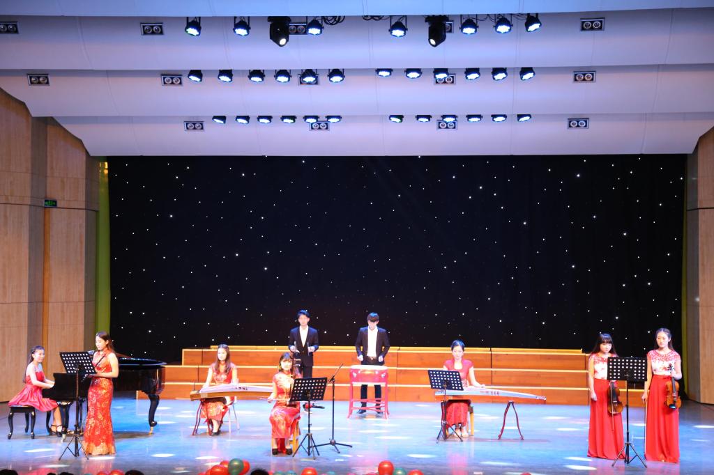 一首由李瑞娇老师担任指挥,由全体成员加音乐舞蹈学院合唱团一起参演的合唱《I will follow him》拉开了此次晚会的帷幕。声乐歌曲《回延安》带我们重温了那神圣的革命圣地,歌曲《我爱我的祖国》表达了我们对祖国由衷的热恋;民乐合奏《紫禁花园》中西乐器的结合更是独具一番魅力,大鼓的坚定、笛子的高亢、小提琴的优雅、二胡的悠扬再配上古筝的婉转带来了一场听觉盛宴;钢琴独奏《月光》让我们沉淀心情静静聆听,仿若沐浴在夜光之下;相声《满腹经纶》活跃了现场气氛,让我们忍俊不禁;舞蹈《KISS》与《梦境》把我们带入了一个神秘的国度,爵士舞《shake it》更是引爆了现场气氛,小品《致青春》爆笑登场,让我们笑声不断;歌舞《礼仪之邦》则为我们展示了汉族服饰的魅力,让我们看到了他们为复兴汉族服饰而做的努力;最后《冬天里的一把火》则实实在在的在晚会结束之际添了一把火,让我们心潮澎湃,在激情的歌声舞蹈中晚会落下帷幕。
