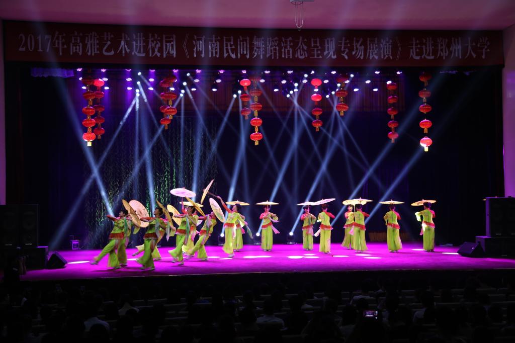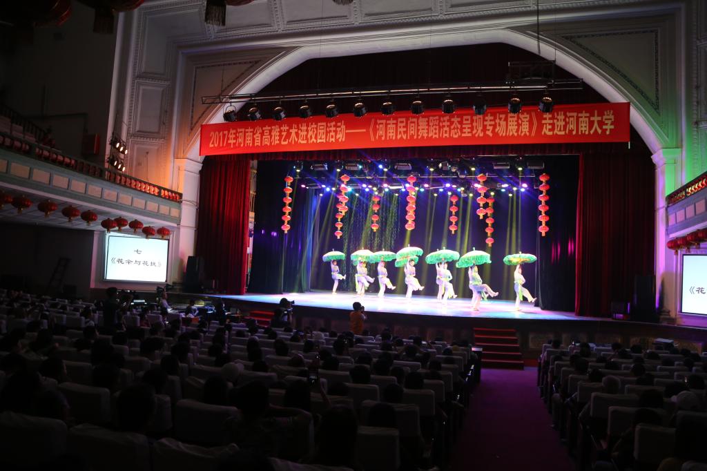 光影流转,弦歌相传。6月9日、13日,由河南省教育厅、文化厅、财政厅主办,我校承办的2017年“高雅艺术进校园——河南民间舞蹈活态呈现”分别在河南大学(明伦校区)大礼堂、郑州大学(南校区)学习堂精彩展演。省教育厅副巡视员李金川、郑州大学党委书记牛书成、副书记李兴成、郑州大学副校长韩国河,河南大学副校长张宝明和我校领导陈建国、赵继红、马超、孙海等领导嘉宾出席观看表演,与两校师生共享艺术盛宴。