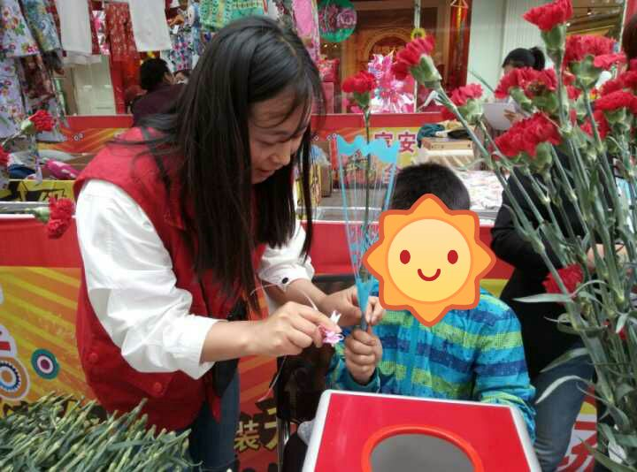 “妈妈,星星的妈妈,你曾满含泪花,却不悔陪伴我长大”母亲节(五月十四日)这天,音乐舞蹈学院雷锋连的志愿者们一起和爱星特教还有爱迪听力回复的师生在时代广场义卖鲜花。玫瑰是情人节之花,康乃馨是母亲节之花。康乃馨代表着温暖亲情,柔美,美得让人心碎。康乃馨的花语是热情,魅力,母亲我爱你,温馨的祝福,浓郁的亲情,伟大的母亲。