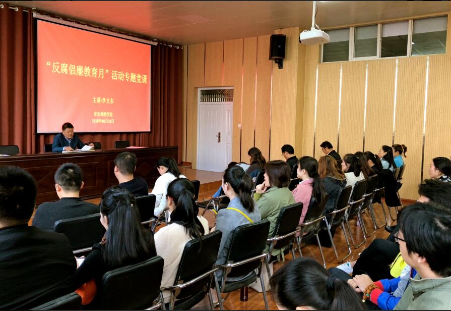 为深入学习贯彻党的十九大精神,认真贯彻落实十九届中央纪委二次全会、十届省纪委三次全会和全省教育系统全面从严治党工作会议精神,推进党风廉政建设和校园廉政文化建设,按照学校《关于开展“反腐倡廉教育月活动”的通知》要求,10月19日下午,音乐舞蹈学院党总支李文东在艺术楼220会议室讲授了一堂了反腐倡廉专题教育党课活动。学院班子成员、全体教职工参加了此次活动。