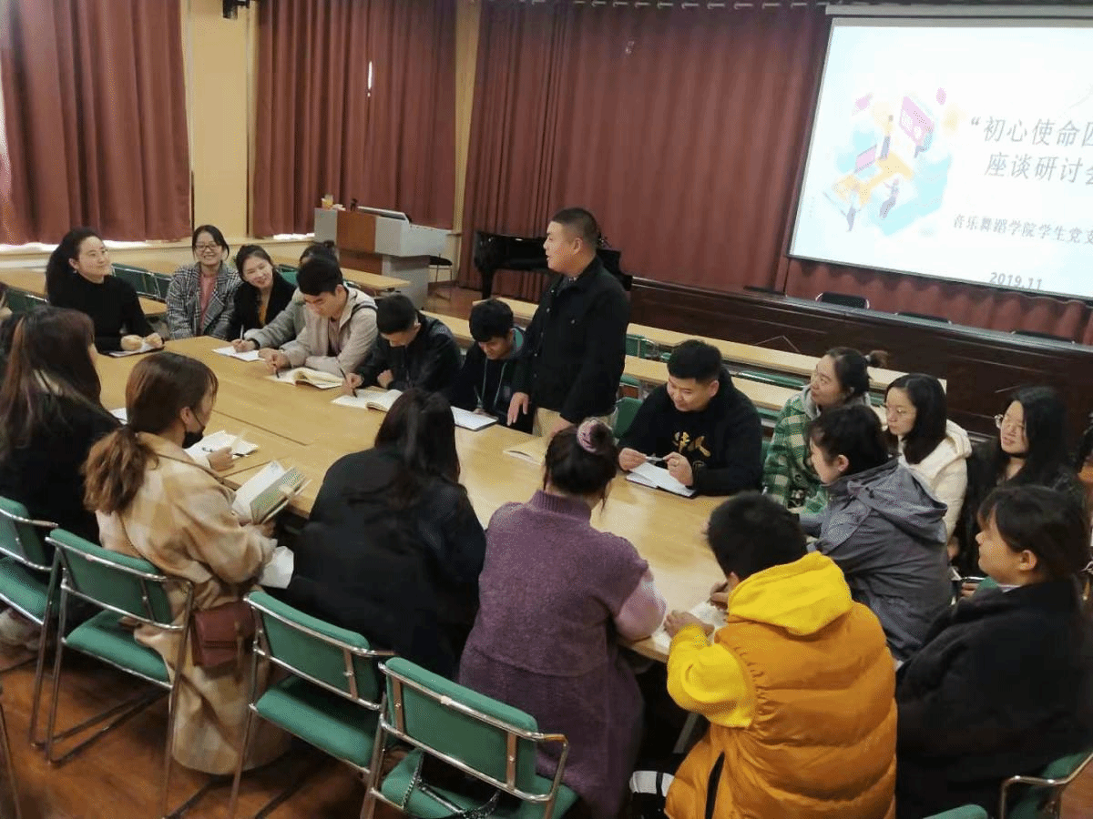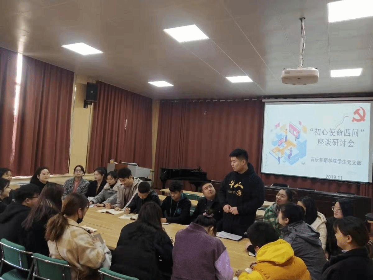 为深入推进“不忘初心、牢记使命”主题教育活动,紧扣主题教育“守初心、担使命,找差距、抓落实”总要求,引导广大党员在活动实施中使命在肩、主动作为。11月14日下午,音乐舞蹈学院学生党支部开展“初心使命四问”主题党日活动暨座谈研讨会。活动由党支部书记刘毅飞老师主持,全体学生党员参加。