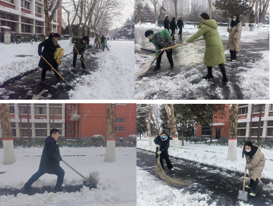 通过一天的共同努力,一场寒冷的大雪融化在大家铲冰扫雪的热情中,学院路及校内责任区主要道路的积雪被清扫一空,确保了校园内外师生员工及许昌市民的出行安全。