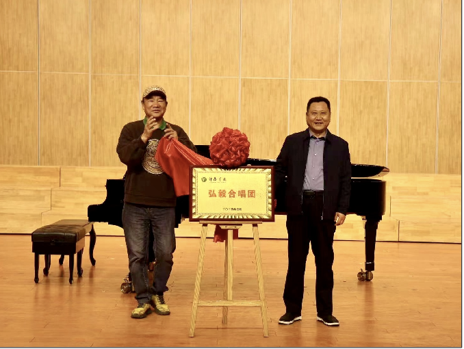 音乐会之前,孙海教授和陈家海教授共同为许昌学院弘毅合唱团揭牌,揭牌仪式由许昌学院音乐舞蹈学院党委书记杨天宏主持。