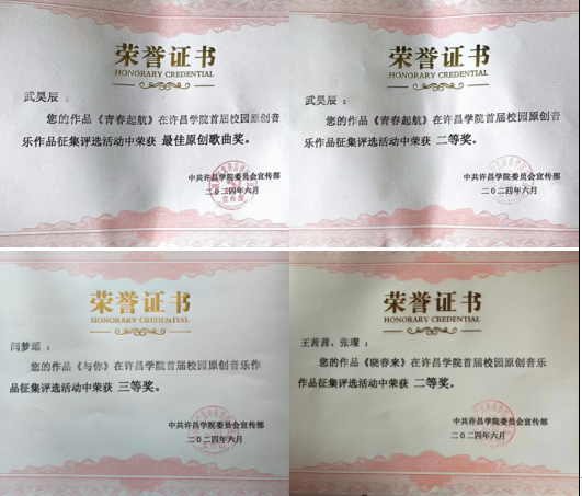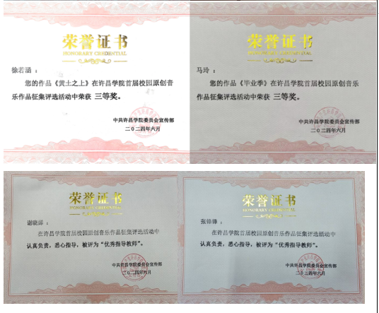 为庆祝新中国成立75周年深入贯彻落实习近平文化思想凝练大学精神,厚植大学文化前期,许昌学院党委宣传部(新闻中心)面向全校征集校园原创音乐作品,经专家组评审共评选出12项作品获一、二、三等奖,其中我院共获得8项,杨天宏副教授作品荣获一等奖;21级音乐学武昊辰作品《青春启航》荣获最佳原创歌曲奖;21级音乐学张璨、王茜茜作品《晓春来》荣获二等奖。