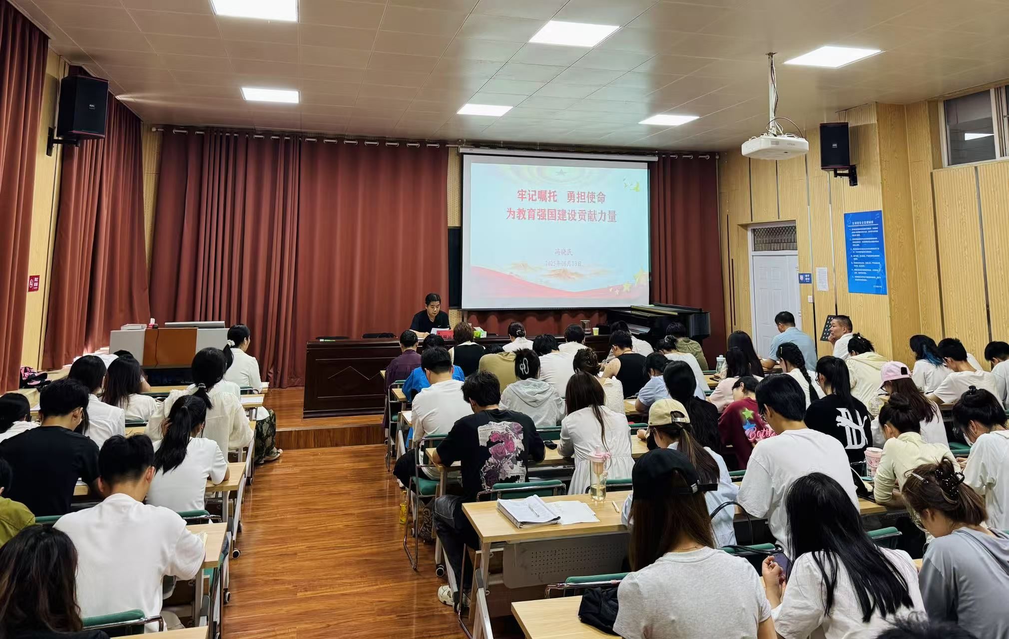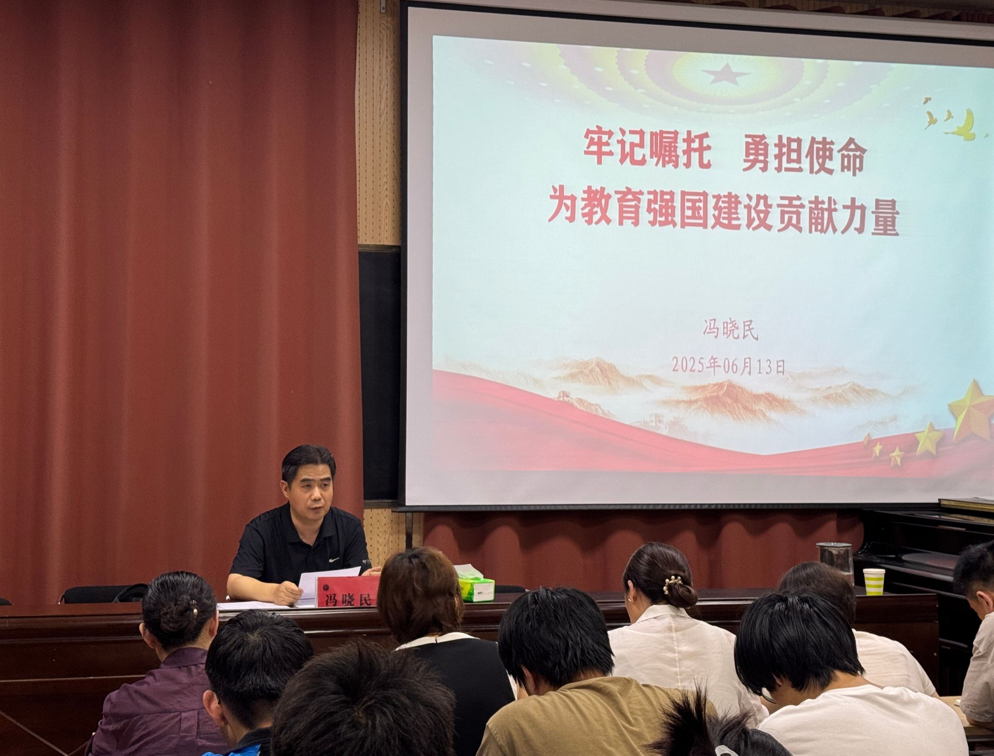 6月13日下午,副校长冯晓民在艺术楼会议室为音乐舞蹈学院师生讲授题为“牢记嘱托、勇担使命 为教育强国建设贡献力量”的专题党课。党课由院党委书记刘斌主持,学院领导班子、教工党员、学生党员及学生干部代表参加学习。