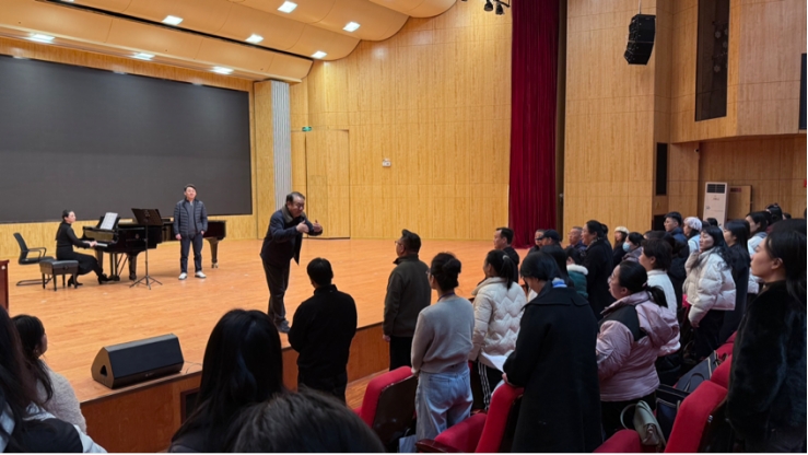 中国音乐家协会理事、河南音协主席、河南理工大学音乐学院院长李新现教授以《声、韵、美:声乐演唱的情感表达》为题,开展全天沉浸式大师课。他通过亲身示范和一对一精准指导,将“以情带声”的抽象理论转化为可操作的教学方法,帮助学员掌握声乐教学的核心要领。