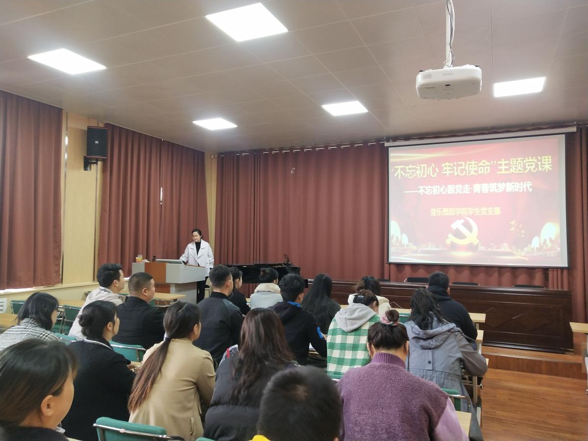为深入开展“不忘初心、牢记使命”主题教育,2019年11月8日下午,音乐舞蹈学院学生党支部在艺术楼220开展“不忘初心、牢记使命”主题党课,党课由学生党支部书记刘毅飞主讲,学生党支部入党积极分子、发展对象、全体党员参加了此次党课。